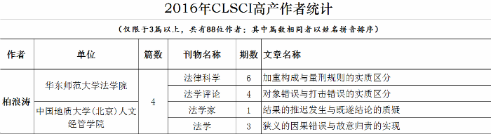 近日,中国法学会法律信息部发布了2016年度CLSCI高产作者榜单,我院柏浪涛副教授上榜,2016年柏浪涛副教授分别在《法律科学》、《法学评论》、《法学家》和《法学》上共发表论文4篇。