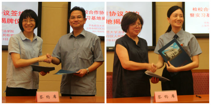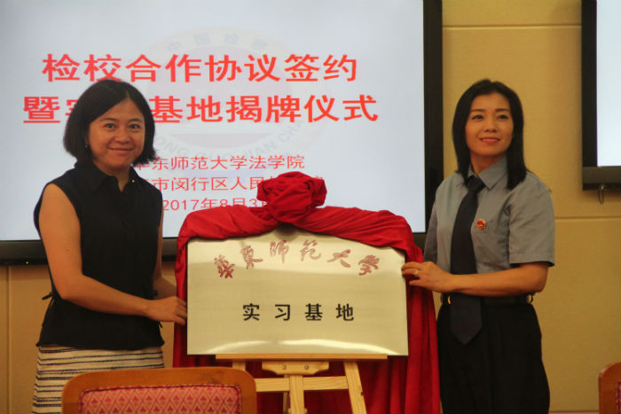 2017年8月3日下午,600cc全讯白菜网与闵行区人民检察院的检校合作协议签约暨实习基地揭牌仪式在闵行检察院举行。闵行检察院副检察长张晨、政治部主任顾惠忠、未检科科长杨珍、实习生导师代表,600cc全讯白菜网党委书记张惠虹、副院长岑峨、黄欣教授、孟凡壮博士以及600cc全讯白菜网师生代表等出席。仪式由闵行检察院政治部主任顾惠忠主持。