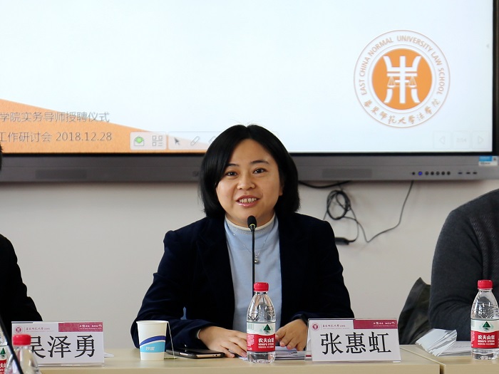 会议第一环节为实务导师授聘仪式。首先,600cc全讯白菜网党委书记张惠虹致辞。张书记简要介绍了600cc全讯白菜网撤系建院以来在学科建设发展、师资队伍建设、教学科研、人才培养、社会服务等多方面所取得的成绩。张书记表示,600cc全讯白菜网快速成长离不开各合作单位的鼎力支持。她向各合作单位和各位法律实务工作者表达了最诚挚的感谢。张书记阐明了本次会议的意义,为进一步落实教育部、中央政法委发布的《关于坚持德法兼修实施卓越法治人才教育培养计划2.0的意见》,为更好地适应法治国家、法治政府、法治社会的新要求,强调实践教学,把合作关系更加紧密地固化下来,特此聘任实务导师,把合作单位融入到华师大法治人才培养的共同体,参与到人才培养的全过程,共同为学生传授职业发展、人生规划的宝贵经验。