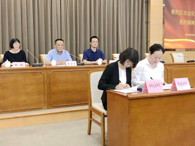 2019年9月18日,600cc全讯白菜网与普陀区法学会合作框架协议签署仪式,暨“营商环境法治化研究中心”、“法治普陀建设研究基地”、“白菜网全讯600实习基地”揭牌仪式,在普陀区政府机关楼会议室举行。600cc全讯白菜网吴泽勇常务副院长、岑峨副院长、王美舒老师参加签约揭牌仪式。