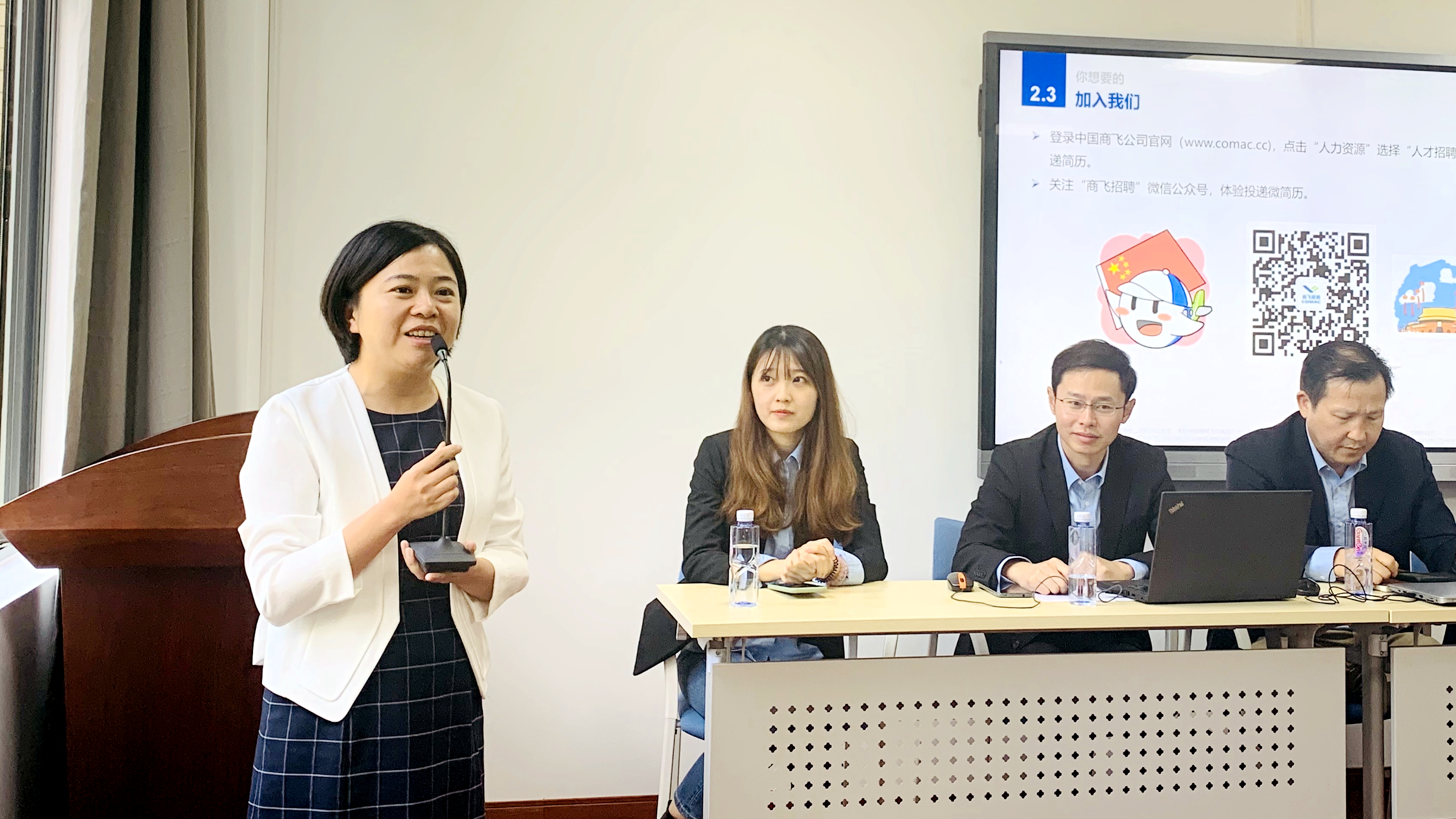 上飞院党委委员、纪委书记王丰超向毕业班学生们介绍了中国商飞“一个总部、六大中心”整体布局,着重展示了上海飞机设计研究院的企业使命、重要定位、部门设置、人才培养体系以及青年员工发展状况等方面。“选择商飞,就是选择责任和使命,就是选择光荣和梦想,就是选择幸福生活和全新的生活方式”,王书记的精彩宣讲更让到场学生备受鼓舞,期待能有机会投身大飞机事业,在实现航空梦和中国梦的伟大征程上努力贡献一份自己的力量。