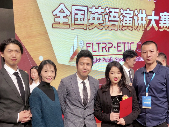 王嫣同学坦言,成功的背后是勇气和坚持的支撑。决赛赛程安排紧张,长达一周的比赛期间,新话题不间断发布,为充分备战,她每天睡眠不足六小时。在这种全身心投入的备战状态下,王嫣同学以充实且富有感染力的演讲表达和灵活大气的临场应对,赢得了观众和评委的一致好评。同时,指导老师、外语学院赵朝永老师获指导教师特等奖。