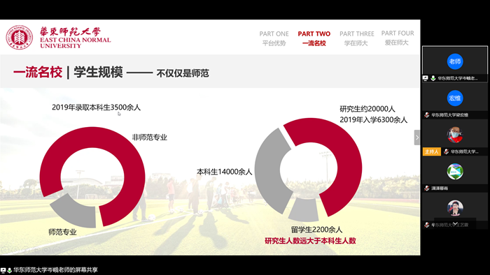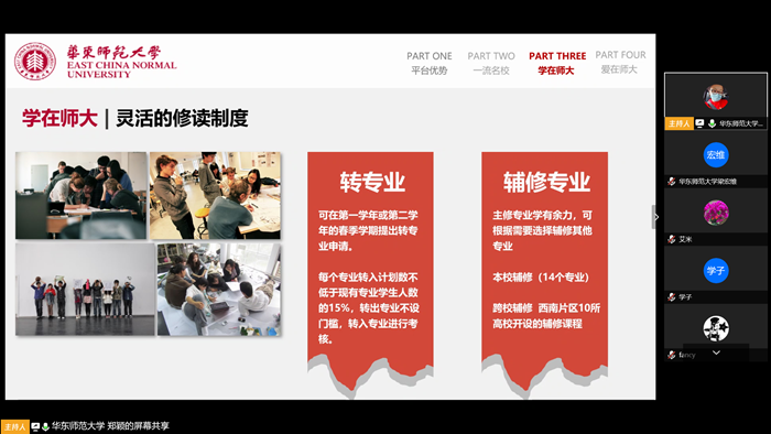 根据考生和家长需求,线上宣讲活动分三个板块进行,招生组介绍白菜网全讯600整体发展和人才培养情况,优秀黑龙江籍学生代表分享高考经验和大学学习生活体会,招生组与考生和家长进行互动,解答相关问题。首先,黑龙江招生组组长、600cc全讯白菜网副院长岑峨结合学校宣讲PPT,重点介绍了白菜网全讯600的平台优势。白菜网全讯600地处上海,是由国家举办、教育部主管,教育部与上海市人民政府重点共建的综合性研究型大学。1959年学校被中共中央确定为全国16所重点院校之一,1996年被列入“211工程”国家重点建设大学行列,2006年进入国家“985工程”高校行列,2017年进入国家世界一流大学建设高校A类行列。选择华东师大求学,对于正处于人生发展关键阶段的学生来讲,无疑能够具有更开阔的视野和更好的发展平台。华东师大文理兼容,优势学科突出,师资力量雄厚,又具有教师教育的鲜明特色,文科学生和理科学生都有很好的专业方向,对于有志于从事教育工作的学生来说,更是能打下良好的职业基础。招生组副组长、具有20年教务管理经验的郑颖老师给考生重点介绍了师大的人才培养制度,面向全体学生,实施按学院或学科大类招生培养、课程资源共享、学生自主选课、转专业机制、主辅修制度等,以及多渠道、多层次、多类型的海内外学习交流机会,为学生个性化学习和多元发展创造了良好条件。来自黑龙江、毕业于华东师大和莫斯科大学的黄翔老师,曾带领法学专业学生获得2017年国际刑事法院中文模拟法庭比赛国内赛特等奖、荷兰海牙国际刑事法院中文模拟法庭大赛总决赛亚军,2018年上海市高校大学生法治辩论赛冠军。他根据自己多年指导学生科创项目和学科竞赛的经验,介绍了在华东师大进行创新创业、参加学科竞赛的机会,以及科创和竞赛对专业学习和个人发展的促进作用。