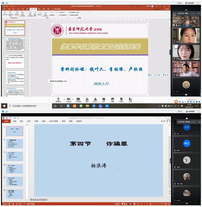 首先,钱叶六和柏浪涛两位老师为大家开设了示范课。钱叶六教授就“陆某华帮助谢某某盗窃望风案”为例与李林倚、卢欣怡等学生代表开展了一堂生动的互动讨论课。接着,柏浪涛老师就“诈骗罪”的内容进行了一场有理论、有案例的精彩的案例教学示范课。2020年春季学期,钱叶六教授领衔的刑法学科团队开设的《刑法总论》在中国大学MOOC上线,得到了社会各界的广泛关注、欢迎和好评,吸引了包括高校学子、公检法律所实务部门人士及其他社会人士近3万人参加,在中国大学MOOC网上开设的法学类课程中名列前茅。此次两位老师的在线示范课,给参加研讨活动的师生留下了深刻的印象。
