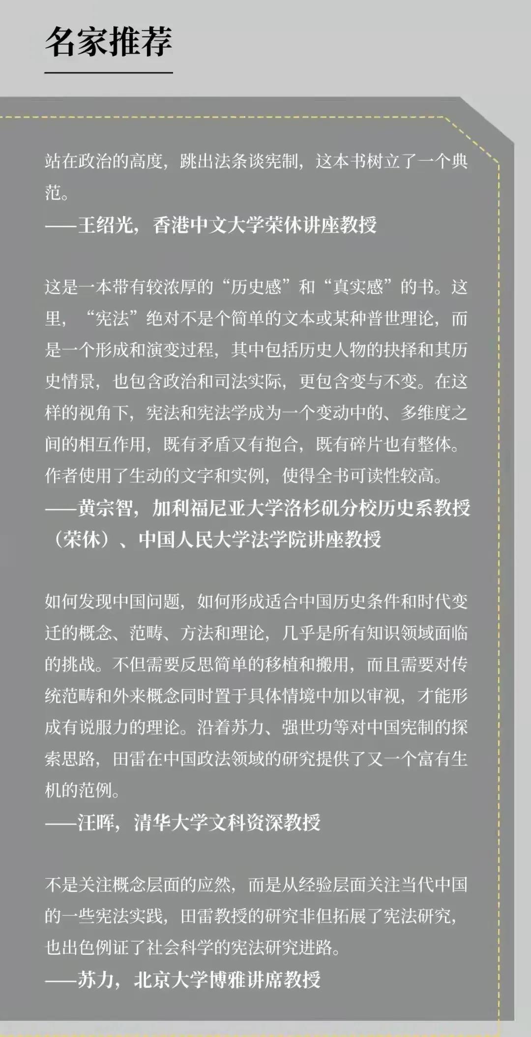 在“十大法治好书”的评语中,针对田雷教授的新书写道:“《继往以为序章》立足于中国宪法的自身实践,从时间和空间两个范畴,探讨中国宪法制度如何深刻影响中国社会历史变革和制度创新,揭示宪法在理论和实践双重维度上的演进,展现中国宪法的自身逻辑与发展道路。同时,该书还围绕中国宪法的实际框架,具体分析和研究了中国国家治理体系的合理性及其积极意义。可以说,该书不仅拓展了宪法研究的进路和范式,而且树立了‘站在政治的高度,挑出法条谈宪制’的典范。”