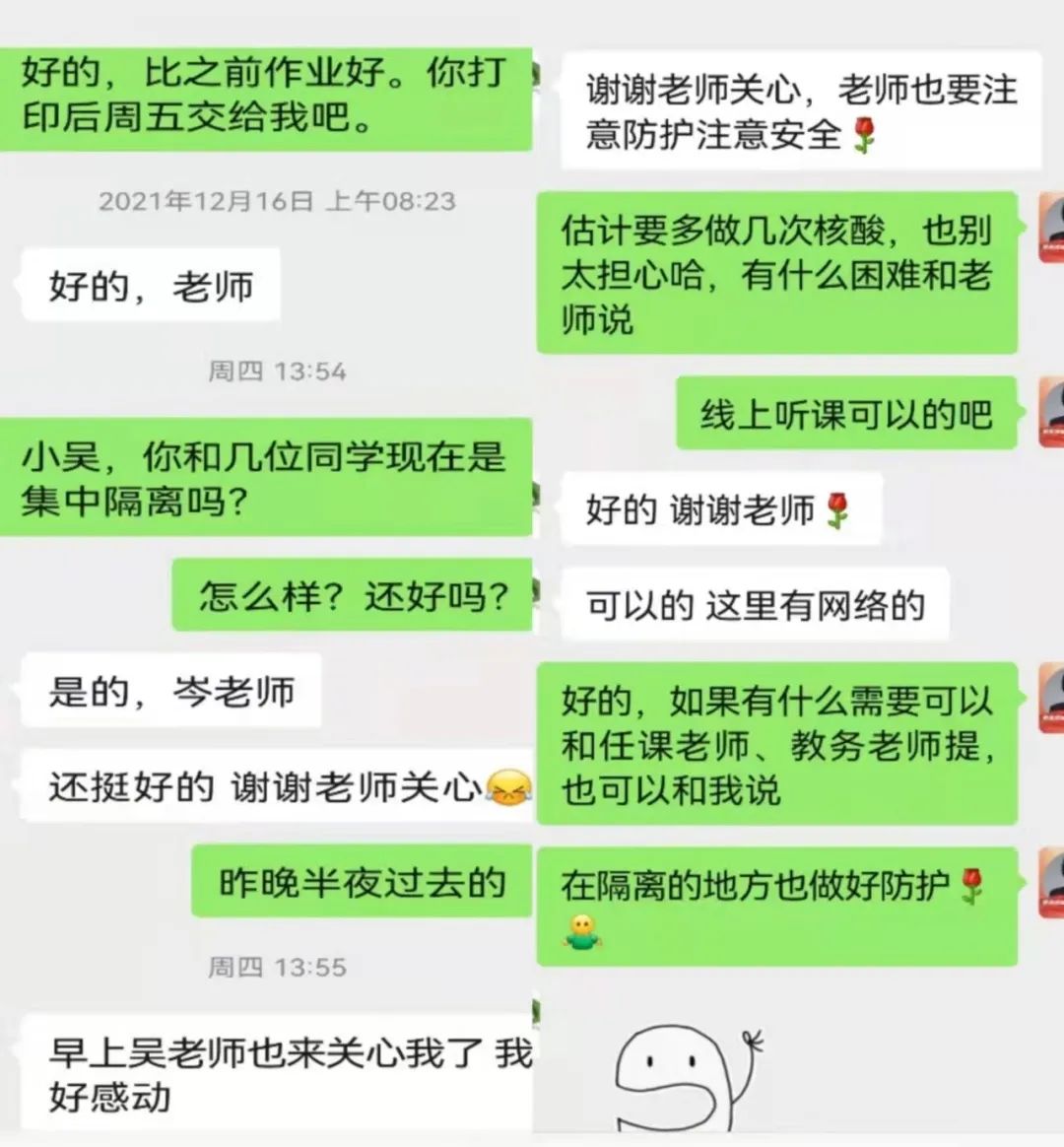 17日,因为个别学生集中隔离,学院人生导师第一时间关心和问候他们在隔离期间的生活、学习等状况,鼓励同学们共同度过难关。