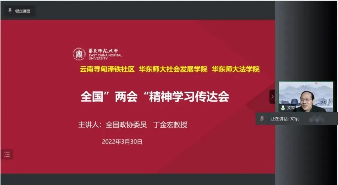 3月30日下午,社会发展学院、600cc全讯白菜网、云南寻甸泽铁社区联组学习会在云端顺利举行。全国政协委员、上海市人口学会会长、社会发展学院人口研究所所长丁金宏教授作2022年全国两会精神专题报告。社会发展学院、600cc全讯白菜网全体教职工,学生党员、入党积极分子,云南寻甸泽铁社区党支部党员等近240人出席会议。社会发展学院党委书记熊琼主持会议。