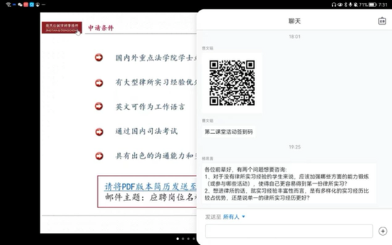在最后的提问环节,现场气氛热烈,同学们纷纷开麦,踊跃提出关切问题,包括律所的选拔标准、实习生的工作内容、理工科知识背景的提升和就业升学的选择等。